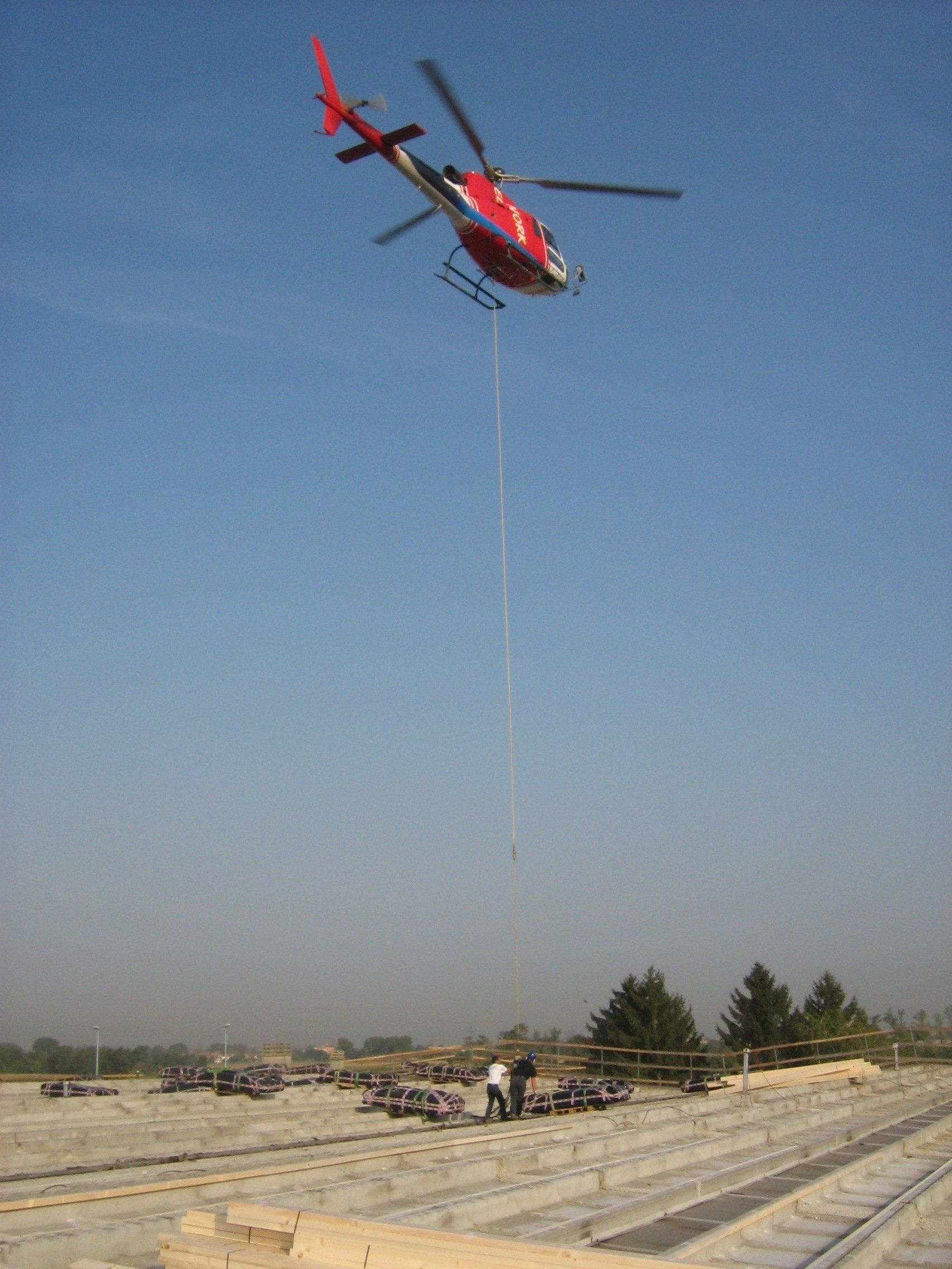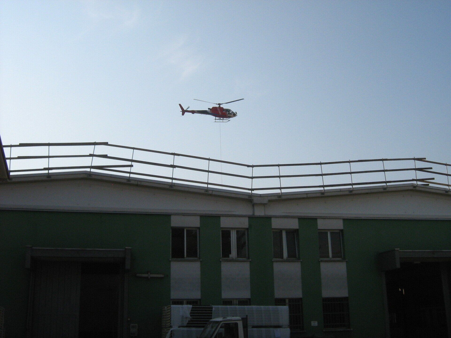Nell'era di grandi costruzioni e grandi superfici, buona parte delle aziende si avvale di grandi autogrù. Noi no! Siamo in grado di eseguire lavorazioni con l'elicottero munito di gancio baricentro, con portate da Kg 1.000,00 a Kg 2.800,00. Il servizio in elicotteri ci permette di arrivare dove una normale autogrù non arriva; inoltre la velocità di esecuzione dell’opera viene notevolmente ridotta. Completiamo il servizio conseguendo direttamente tutte le autorizzazioni di sorvolo e atterraggio. Oltre al servizio di calo a terra/tiro in quota materiali, effettuiamo servizio di trasporto passeggeri in elicottero a prezzi molto competitivi.
